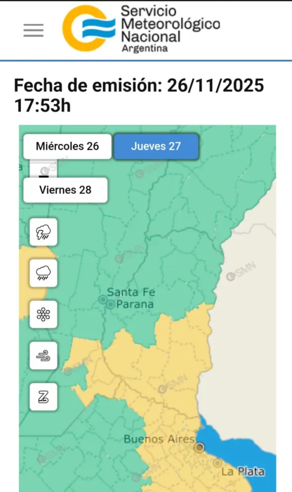 De acuerdo al alerta amarilla los departamentos, Islas del Ibicuy, Gualeguay, Gualeguaychú, Uruguay, Victoria, Tala y Colón serán afectados por tormentas aisladas de variada intensidad, algunas localmente fuertes. Las mismas podrían provocar chaparrones intensos, actividad eléctrica frecuente, ráfagas que pueden superar los 75 kilómetros por hora y ocasional caída de granizo. Se prevén valores de precipitación acumulada entre 40 y 60 milímetros, pudiendo ser superados en forma puntual.