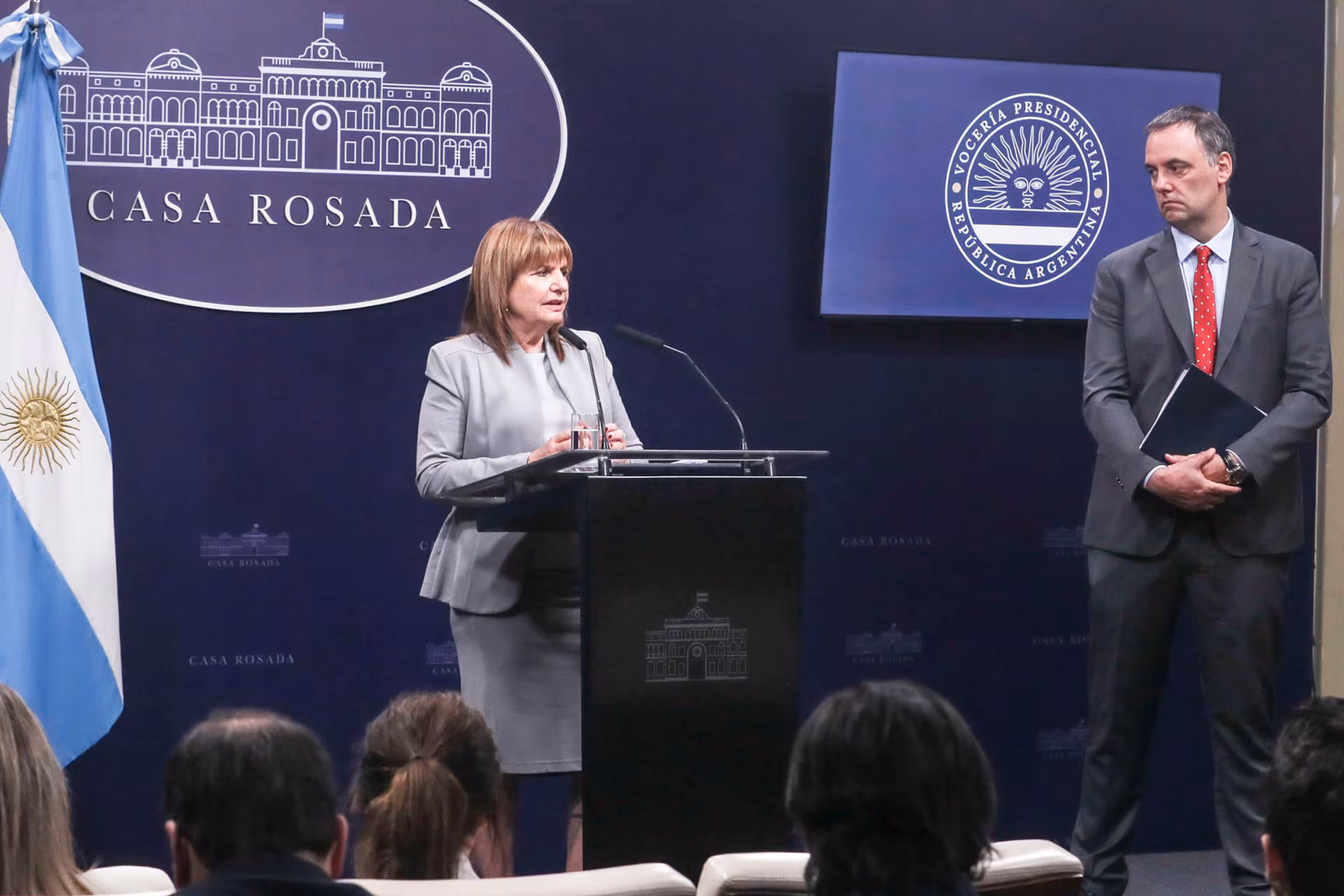 En la conferencia de prensa que encabezaron Bullrich y el jefe de Gabinete Manuel Adorni también estuvo Alejandra Monteoliva, que asumirá al frente de la cartera de Seguridad este martes a las 12; la secretaria legal y técnica María Ibarzabal y el viceministro de Justicia Sebastián Amerio. Todos ellos trabajaron en el texto que aún no fue presentado.