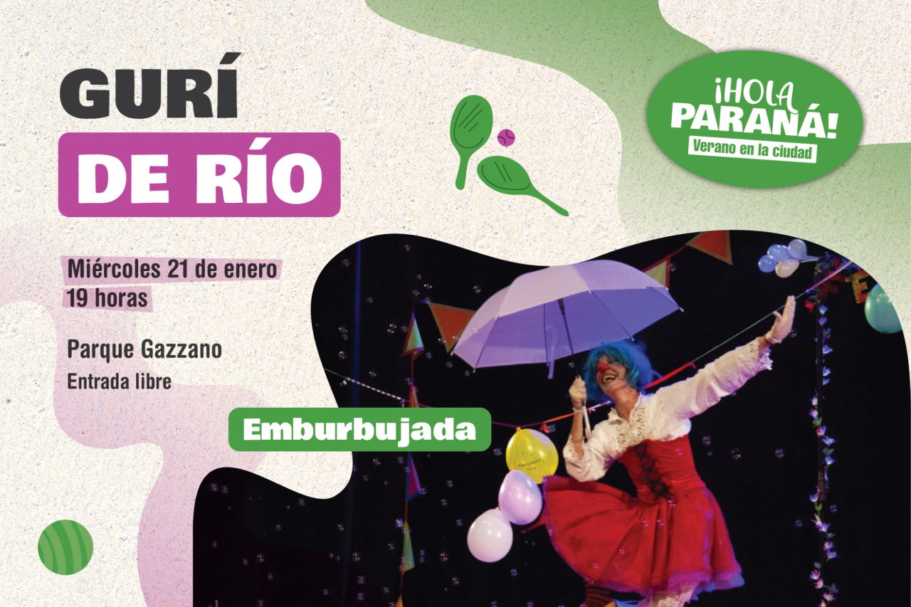 Este miércoles 21 de enero a las 19 horas, en el Parque Gazzano, se realizará una nueva jornada de Gurí de Río, propuesta cultural de la Municipalidad de Paraná destinada a infancias y adolescencias. La actividad es de acceso libre y contará con la participación del grupo teatral Emburbujada.