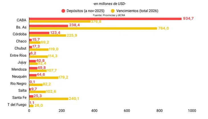 “A nivel agregado, los trece subnacionales con títulos en dólares registraban a noviembre de 2025 depósitos por u$s1.507 millones, frente a vencimientos en moneda extranjera por u$s2.479 millones durante 2026”, dice el informe.