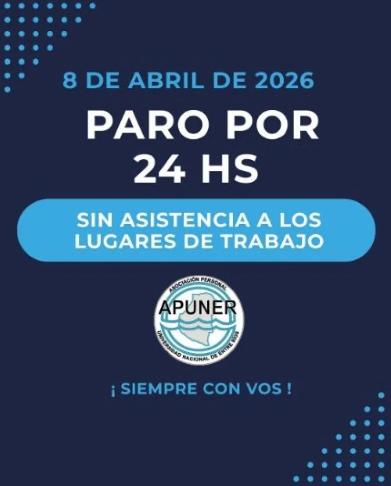 La Asociación del Personal de la Universidad Nacional de Entre Ríos (Apuner) anunció la continuidad de su plan de lucha con la convocatoria a tres nuevos paros de 24 horas sin asistencia a los lugares de trabajo, en el marco del estado de alerta y movilización en defensa de la universidad pública, salarios dignos y paritarias libres. El primero será este miércoles 8 de abril.