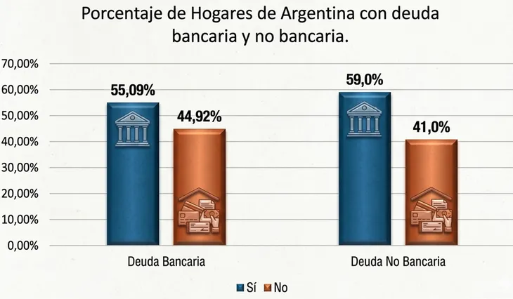 El informe señaló una modificación en la composición del financiamiento familiar. En 2023, el 41,3% de los hogares tenía deuda bancaria y el 82,6% algún tipo de deuda no bancaria. Para 2025, esos porcentajes pasaron a 47,9% y 61,6%, respectivamente.